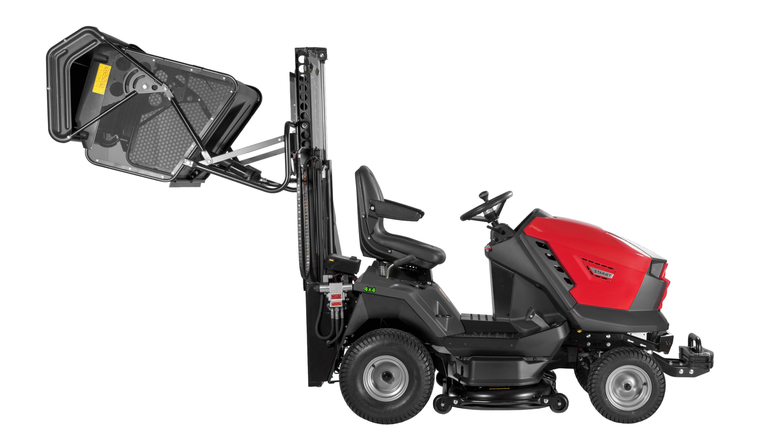 Přestože je tento model vybaven robustní košovou nástavbou s vysokozdvižným vyklápěním, zachovává si skvělou svahovou dostupnost a díky kompaktním rozměrům také vynikající manévrovatelnost. Stejně jako u všech modelů Starjet, i zde najdeme dvourotorové sečení umístěné mezi nápravami, které zajišťuje precizní a efektivní práci.